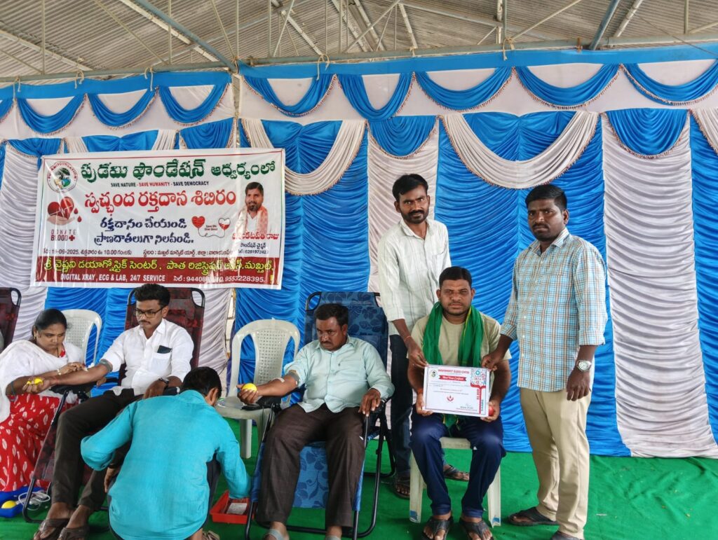 నారాయణపేట, మన ప్రజాపక్షం :పుడమి ఫౌండేషన్ ఆధ్వర్యంలో నిజాంకు వ్యతిరేకంగా పోరాటం చేసి అమరులైన తెలంగాణ పోరాట యోధులను స్మరించుకుంటూ స్వచ్ఛంద రక్తదాన శిబిరాన్ని ఏర్పాటు చేయడం జరిగింది. ఈ కార్యక్రమాన్ని ఉద్దేశించి పుడమి ఫౌండేషన్ చైర్మన్ వెంకటపతి రాజు మాట్లాడుతూ తెలంగాణ విముక్తి కోసం పోరాటం చేసిన తెలంగాణ అమరవీరులు మనందరికీ స్ఫూర్తిదాయకమని అట్లాంటి గొప్ప త్యాగాలు కలిగిన మనుషులను గుర్తు చేసుకుంటూ రక్తదాన శిబిరాన్ని ఏర్పాటు చేశామని అన్నారు. రక్తదానం చేయడం వల్ల ఎంతో మందికి ప్రాణదాతలుగా మిగిలిపోయే గొప్ప అవకాశం లభిస్తుందని అన్నారు మానవ శరీరంలో ఎర్ర రక్త కణాలు 120 రోజులకు ఒకసారి చనిపోయి మళ్లీ పునరుద్ధరించబడతాయని కాబట్టి తప్పనిసరిగా ప్రతి మనిషి రక్తదానం చేయడం బాధ్యతగా స్వీకరించాలని కోరారు ఈ రక్తదాన శిబిరానికి దాదాపు 35 మంది దాకా యువకులు హాజరై రక్తదానం చేయడం అభినందనీయమని వారందరికీ ప్రత్యేక కృతజ్ఞతలు తెలియజేశారు. పుడమి ఫౌండేషన్ పర్యావరణాన్ని కాపాడడంతో పాటు మానవత్వాన్ని నిలబెట్టడం ప్రజాస్వామ్యాన్ని కాపాడుకోవడమే లక్ష్యంగా పనిచేస్తుందని దేశంలోని యువత పర్యావరణాన్ని కాపాడుకోవడం కోసం ముందుకు రావాలని ఆ క్రమంలో పుడమి ఫౌండేషన్ మీ అందరి సహకారంతో మరిన్ని సేవా కార్యక్రమాలు చేస్తుందని తెలియజేశారు.