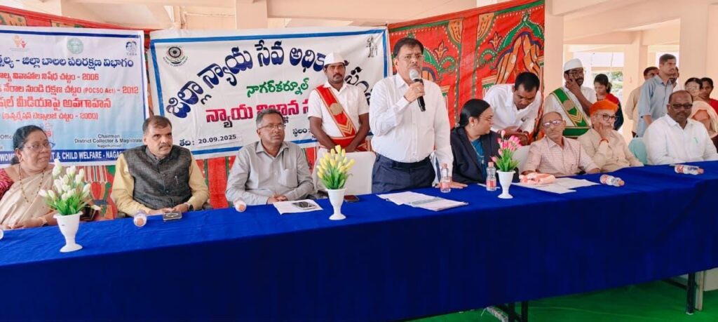నాగర్ కర్నూల్, మన ప్రజాపక్షం : నాగర్ కర్నూల్ జిల్లా న్యాయ సేవ అధికార సంస్థ ఆధ్వర్యంలో జిల్లా కోర్టు ప్రాంగణంలో న్యాయ విజ్ఞాన సదస్సు నిర్వహించడం జరిగింది. ఈ కార్యక్రమానికి ముఖ్యఅతిథిగా డి రమాకాంత్ ప్రిన్సిపల్ డిస్ట్రిక్ట్ అండ్ సెషన్స్ జడ్జ్ మరియు చైర్మన్ డిస్టిక్ లీగల్ సర్వీసెస్ అథారిటీ హాజరై విద్యార్థులను ఉద్దేశించి మాట్లాడుతూ విద్యార్థులు ప్రతి ఒక్కరు చదువుకొని జీవితంలో ఉన్నత శిఖరాలు అధిరోహించాలి అని అన్నారు. అదేవిధంగా విద్యార్థి, విద్యార్థినీలకు బాల్యవివాహాలు వాటి వల్ల జరిగే పరిణామాలు వివరించడం జరిగింది. బాల్య వివాహాలు అనేవి జరగడానికి ముఖ్య కారణం నిరక్షరాస్యత అని అన్నారు. అందువల్ల ప్రతి ఒక్కరు చదువుకోవడం వల్ల బాల్యవివాహాలను అరికట్టవచ్చు అని అన్నారు. అదేవిధంగా సోషల్ మీడియా వినియోగం మరియు దానివల్ల జరిగే లాభనష్టాలను వివరించడం జరిగింది. సోషల్ మీడియా పట్ల ప్రతి ఒక్కరు అప్రమత్తంగా ఉండాలి అని అన్నారు. సోషల్ మీడియాను మంచి విషయాల కొరకు మాత్రమే వాడాలి అని, సోషల్ మీడియా వల్ల మనం ఎన్నో కొత్త విషయాలు నేర్చుకోవడానికి అవకాశం ఉంటుంది అన్నారు. అదేవిధంగా మనం సోషల్ మీడియాను తప్పుగా ఉపయోగిస్తే వాటి వల్ల మనకు ఎన్నో అనర్ధాలు జరిగే అవకాశం ఉంది అని అన్నారు. సెక్రటరీ డిస్టిక్ లీగల్ సర్వీసెస్ అథారిటీ నసీమా సుల్తానా మాట్లాడుతూ ప్రతి విద్యార్థి ఒక లక్ష్యాన్ని నిర్దేశించుకుని దానికి అనుగుణంగా కష్టపడి చదువుకోవాలి అని అన్నారు. అబ్దుల్ కలాం చెప్పిన విధంగా” కలలు కనండి వాటిని నిజజీవితంలో సహకారం చేసుకోవాలి” అని అన్నారు. కాబట్టి ప్రతి ఒక్కరు వారి కలలు నెరవేరే విధంగా కష్టపడి చదువుకోవాలి అని అన్నారు. ఈ సందర్భంగా నాగర్ కర్నూల్ ,తిమ్మాజిపేట, తెలకపల్లి, తాడూర్, బిజినపల్లి మండలాల పరిధిలోని అన్ని గవర్నమెంట్ పాఠశాలల్లో తేదీ10-09-2025 నాడు 54 పాఠశాలల్లోని సుమారు 6000 మంది విద్యార్థిని ,విద్యార్థులకు నిర్వహించిన వ్యాసరచన మరియు ఉపన్యాస పోటీలలో మండల స్థాయిలో విజేతలుగా నిలిచిన విద్యార్థి, విద్యార్థినీలకు ప్రతి మండల నుంచి వ్యాసరచనలో మొదటి, రెండవ, మూడవ బహుమతి ఉపన్యాసంలో మొదటి, రెండవ, మూడవ బహుమతులను చైల్డ్ వెల్ఫేర్ డిపార్ట్మెంట్ వారి సహకారంతో జిల్లా ప్రధాన న్యాయమూర్తి చేతులమీదుగా విద్యార్థి,విద్యార్థినీలకు బహుమతులను ప్రధానం చేయడం జరిగింది. అదేవిధంగా డిస్టిక్ లీగల్ సర్వీసెస్ అథారిటీ తరఫున చిన్నారులకు సర్టిఫికెట్ అందించడం జరిగింది. చైల్డ్ వెల్ఫేర్ డిపార్ట్మెంట్ యొక్క పోస్టర్ ఆవిష్కరణ చేయడం జరిగింది. అదేవిధంగా నాగర్ కర్నూల్ ఆర్టీసీ బస్టాండ్లో వృద్ధులకు మరియు వికలాంగులకు ఉపయోగపడే విధంగా వీల్ చైర్ను బార్ అసోసియేషన్ నాగర్ కర్