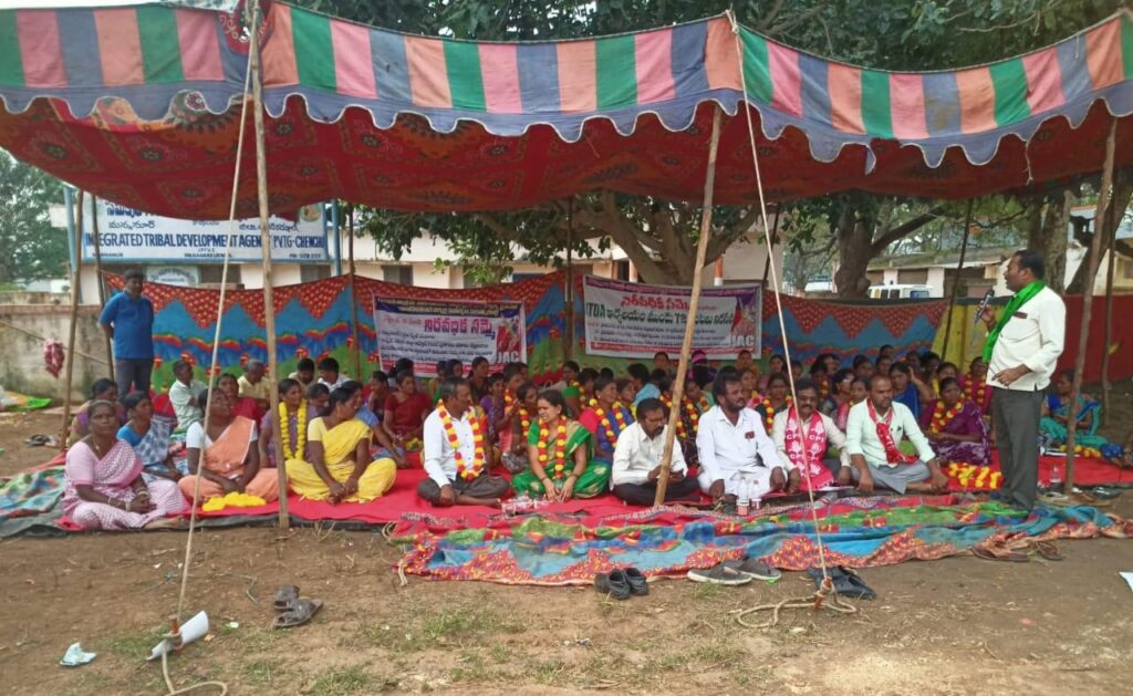 మన్ననూర్, మన ప్రజాపక్షం :మన్నానూర్ ఐటీడీఏ కార్యాలయం ముందు నిరసన తెలియజేస్తున్న గిరిజన ఆశ్రమ పాఠశాల డైలీ వేజ్ వర్కర్ల తమ సమస్యలు పరిష్కరించాలని నేటికీ 34 రోజులుగా నిరసన కార్యక్రమాలు చేస్తూ అందులోనే భాగంగా గత మూడు రోజులుగా 72 గంటలపాటు మన్ననూర్ ఐటిడిఏ కార్యాలయం ముందు సమ్మెకు దిగిన డైలీ వేజ్ వర్కర్లకు తెలంగాణ గిరిజన సంఘం సంపూర్ణ మద్దతును ప్రకటించింది.ఈ సందర్భంగా తెలంగాణ గిరిజన సంఘం నాగర్ కర్నూలు జిల్లా అధ్యక్షులు కాట్రావత్ రవి నాయక్ గిరిజన సంఘం జిల్లా సహాయ కార్యదర్శి జర్పుల శివ ప్రచండ మన్ననూర్ ఐటిడిఏ కార్యాలయం ముందు జరుగుతున్న సమ్మెలో పాల్గొని ప్రసంగించారు. తెలంగాణ రాష్ట్రంలో రాష్ట్రవ్యాప్తంగా లక్ష ఇరవై ఐదు వేల మంది విద్యార్థులు ఈ సమ్మె వల్ల చదువుకు ఆటంకం అవుతుందని వారి చదువు సాఫీగా జరగాలంటే వెంటనే ప్రభుత్వం స్పందించి హాస్టల్ వర్కర్ల సమస్యలు పరిష్కరించాలని డిమాండ్ చేశారు. వారి న్యాయమైన డిమాండ్ అయిన టైం స్కేల్ మరియు 64 జీవోను రద్దు చేయాలని వారికి సంబంధించిన బెనిఫిట్స్ అందజేయాలని పేర్కొన్నారు. రాష్ట్ర ప్రభుత్వంగిరిజన ఆశ్రమ పాఠశాలలో పనిచేస్తున్న డైలీ వేజ్ వర్కర్లు చాలీచాలని వేతనాలతో ఇబ్బందులు ఎదుర్కొంటున్నారని హాస్టల్ వర్కర్ల సమస్యలను పరిష్కరించి వారికి తగు న్యాయం చేయాలని చేయాలని తెలిపారు.